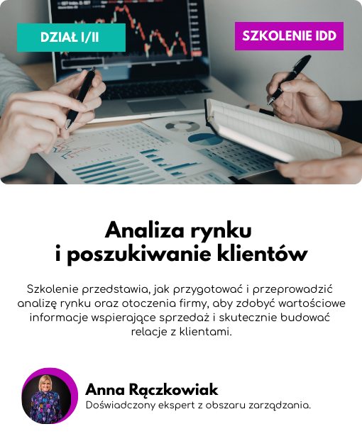 Analiza rynku i otoczenia firmy to zadanie konieczne do odrobienia przed wprowadzeniem oferty na rynek. Stanowi nieodłączny element procesu sprzedaży. Zatem warto wiedzieć jak się do niej przygotować i jakie informacje zbierać by wykonana praca dostarczyła wartościowych informacji. Rynek to miejsce do partnerskich interakcji organizacji z Klientem. Warto zatem wykorzystać dostępne narzędzia by efektywnie budować z nim relacje.