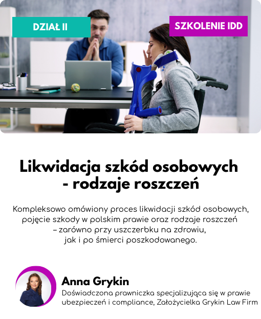 Podczas szkolenia zdobędziesz pogłębioną wiedzę na temat zasad funkcjonowania procesu likwidacji szkód osobowych oraz rodzaje roszczeń. Wyjaśnione zostanie pojęcie szkody w polskim prawie odszkodowawczym oraz proces likwidacji szkód osobowych w oparciu o obecnie obowiązujące standardy oraz stan prawny.