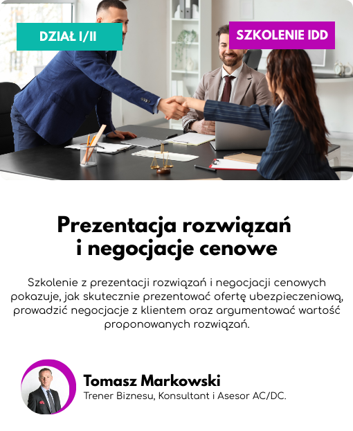 Szkolenie jest częścią kompleksowego pakietu szkoleń, wypełniającego 15-godzinny wymóg szkolenia dla pracowników dystrybuujących produkty ubezpieczeniowe, zawarty w dyrektywie Parlamentu Europejskiego i Rady (UE) 2016/97 z dn. 20 stycznia 2016 r. w sprawie dystrybucji ubezpieczeń oraz Ustawie z dnia 15 grudnia 2017 r. o dystrybucji ubezpieczeń (Dz.U.2018.2210 z dnia 2018.11.27).